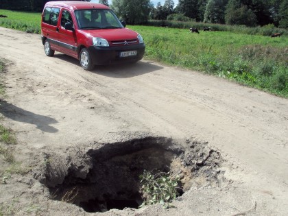 Nedaug trūksta, kad ji padidėtų tiek, jog ten prasmegtų visas automobilis. Duobės kraštai