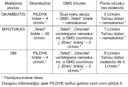 • daug kalbantiems naudinga pasirinkti SKAMBUČIO planą, leidžiantį su kitais PILDYK vartotojais kalbėtis ypač pigiai bet kokiu laiku. Užsisakę šį planą, gali pasinaudoti specialiu pasiūlymu ir visą parą PILDYK vartotojams skambinti tik 4 ct/min. tarifu. Akcijos trukmė ribota;