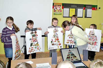 Po to norėjome įsitikinti, ar tikrai vaikai suprato mūsų pamokymus. Tad vyko darbas grupelėse. Kiekvienai grupelei buvo pateiktas vokas su įvairiausiais maisto produktais ir lapas su tuščia piramide. Užduotis – kuo greičiau ir teisingiau „apgyvendinti“ piramidę maisto produktais. Vyresnieji mokiniai tapo konsultantais ir padėjėjais. Visi dirbo noriai ir su dideliu susidomėjimu. Kai kiekvienos klasės atstovas pristatė savo darbą, mama Sveikata tikrino, ar nėra klaidų. Jei jų surado, išsiaiškinome, kodėl taip negali būti. Darbai buvo įdomūs ir patrauklūs. Juos iškabinome mokykloje esančiame stende, kur pristatomas šis projektas ir kviečiama įsitraukti į tolimesnes numatytas veiklas.