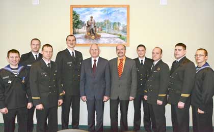 Svečius iš Klaipėdos penktadienio rytą savo kabinete priėmė rajono meras A. A. Greimas ir kiti Savivaldybės atstovai. Pasisveikinę, pabendravę su rajono vadovais, apsikeitę suvenyrais jūreiviai išskubėjo į Vilkaviškio Salomėjos Nėries pagrindinę mokyklą. Čia jie susitiko su vyresniųjų klasių moksleiviais ir pedagogais, kuriems papasakojo apie jūreivišką gyvenimą karo laive, savo tarnybą bei nuo karo užsilikusių minų paieškas jūros gelmėse.