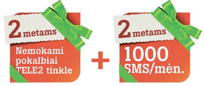 Galimybė iki dvejų metų nemokamai kalbėti „Tele2“ tinkle ir siųsti 1000 nemokamų SMS žinučių į visus Lietuvos tinklus suteikiama naujiems ir esamiems klientams, pratęsusiems ar sudariusiems sutartį metams arba dvejiems bei pasirinkusiems vieną iš siūlomų planų (taikomas mėnesio mokestis – nuo 20 Lt).