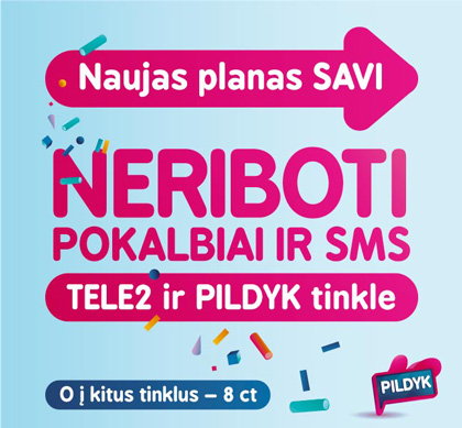 Naujas mokėjimo planas „Savi“ „Pildyk“ vartotojams kainuos vos 11 litų per mėnesį. Jis leis be jokių apribojimų nemokamai skambinti ir rašyti SMS „Pildyk“ ir „Tele2“ tinkluose. Į kitus Lietuvos tinklus skambučiai ir SMS kainuos 8 centus už minutę ar SMS.