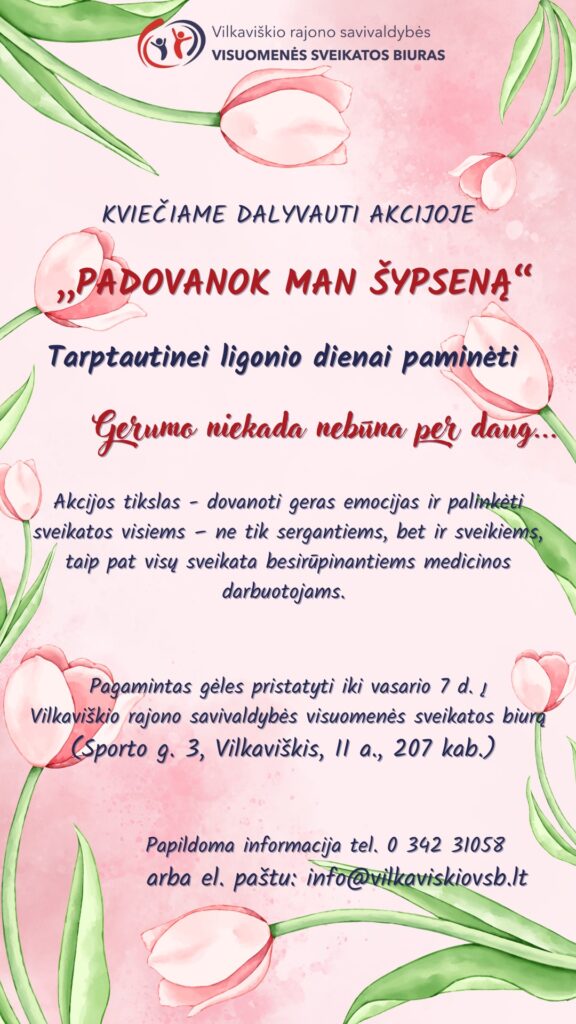 Vilkaviškio rajono savivaldybės visuomenės sveikatos biuras kviečia dalyvauti akcijoje „Padovanok man šypseną“ Tarptautinei ligonio dienai paminėti.