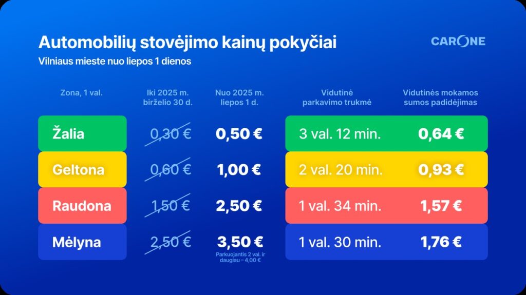 Pasikeitus įkainiams, augs vidutinė mokėtina suma, kuri, „carOne“ skaičiavimais, turėtų padidėti iki 1,60 Eur žalioje zonoje, iki 2,33 Eur – geltonoje, iki 3,92 Eur – raudonoje bei iki 5,53 Eur mėlynoje zonoje.
